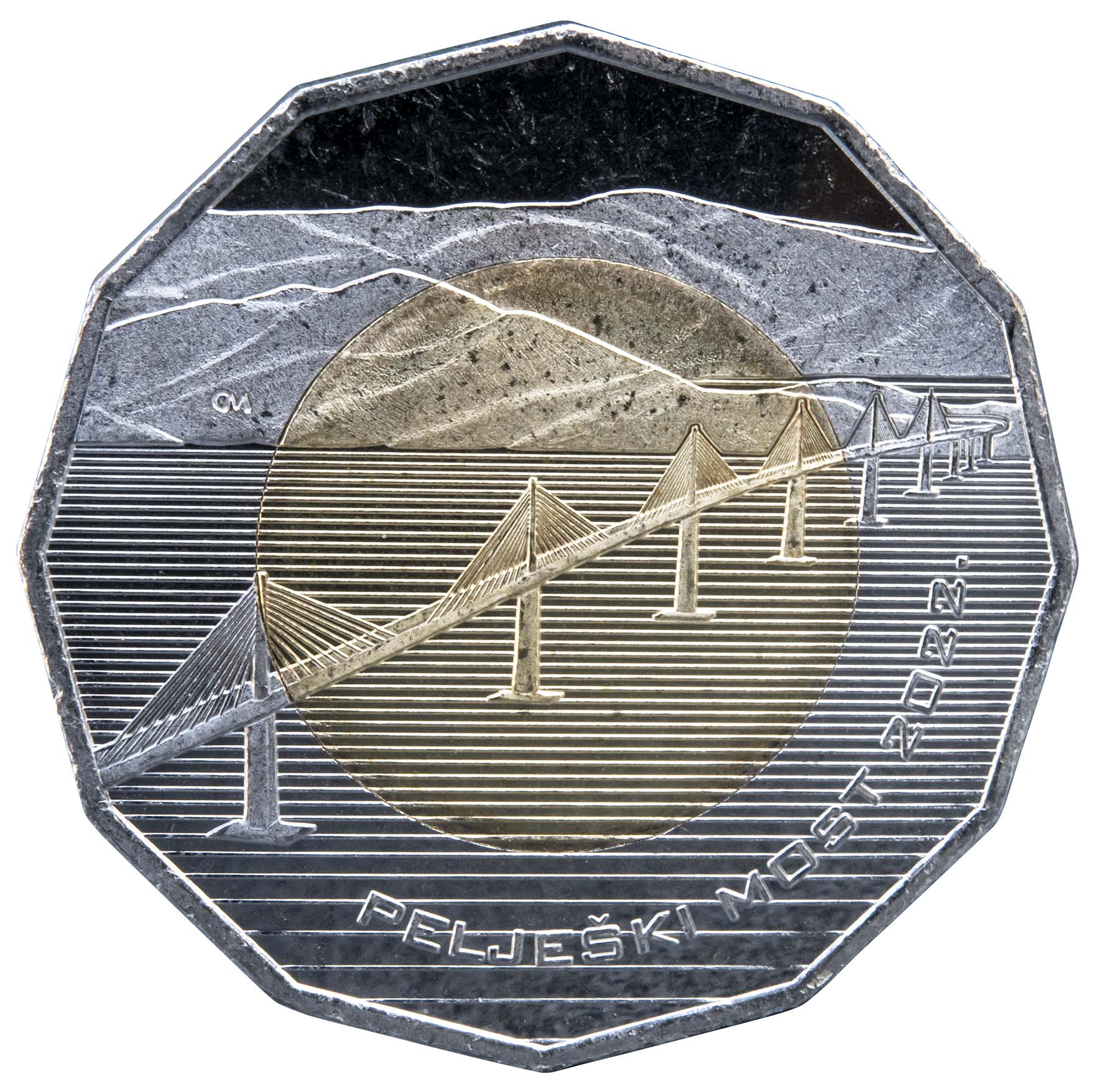 Motiv na licu: Unutar jezgre kovanog novca i djelomično na prstenu kovanog novca nalazi se prikaz Pelješkog mosta. Djelomično unutar jezgre i djelomično na prstenu kovanog novca, a u vizuri smješten iza mosta, nalazi se također prikaz dijela poluotoka Pelješca koji se na tom području mostom spaja s kopnom Republike Hrvatske. Na prstenu kovanog novca, ispod prikaza Pelješkog mosta ispisan je tekst "PELJEŠKI MOST" i godina izdanja kovanog novca "2022.".