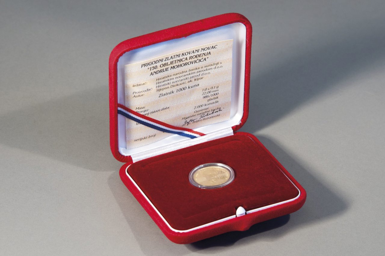 Hrvatska narodna banka u suradnji s Hrvatskom kovnicom novca izdala je prigodni zlatni kovani novac u povodu 150. obljetnice rođenja Andrije Mohorovičića, istaknutog znanstvenika na području meteorologije i seizmologije, koji spada među najveće hrvatske znanstvenike, a svjetski ga geofizičari uvrštavaju među istaknute velikane seizmologije 20. stoljeća.